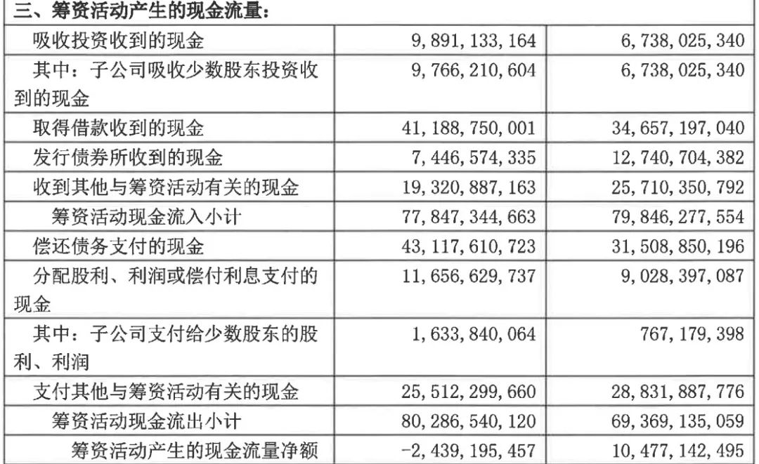 其中籌資流入的現(xiàn)金同比減少了,主要減少在發(fā)行債券這一項(xiàng);但償還債務(wù)同比增加了100多億,直接導(dǎo)致籌資活動的現(xiàn)金流量凈額為負(fù)。