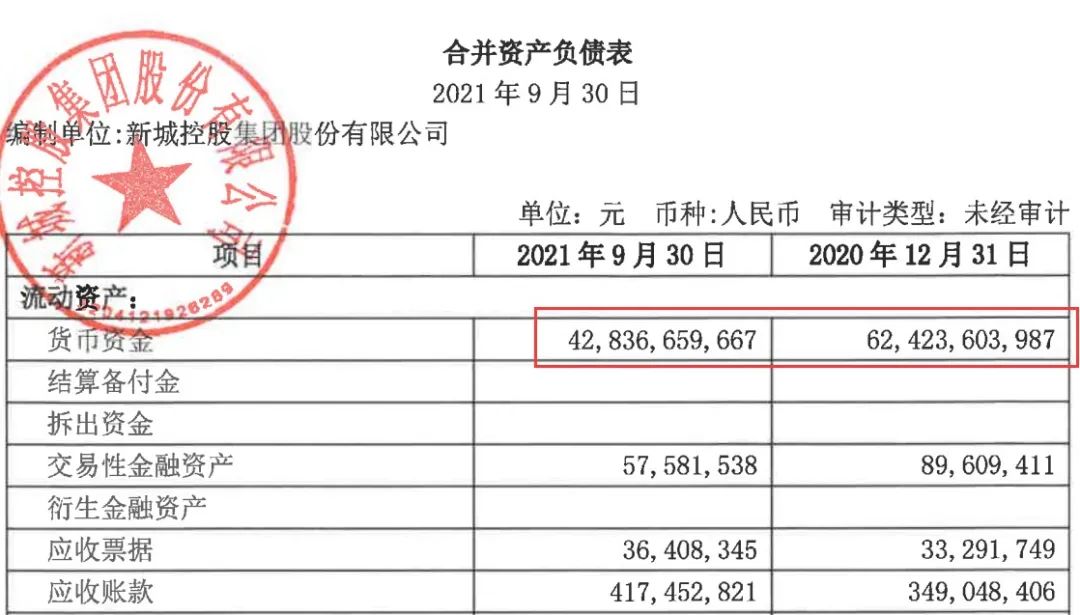 另外值得注意的是快速下降的貨幣資金。三季報數(shù)據(jù)里,新城控股截至2021年9月30日的貨幣資金為428.37億元,比去年底的624.24億元減少近196億元。