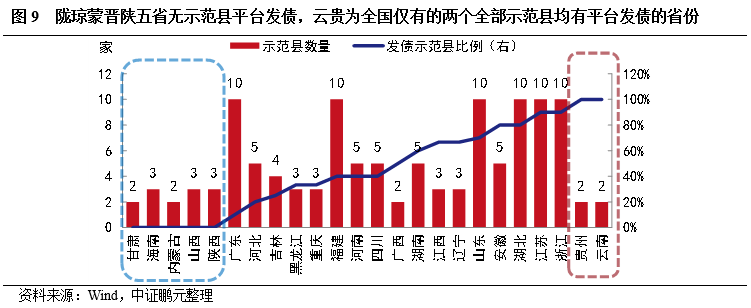 相較之下,貴州、云南兩省,盡管地區經濟亦偏弱,但因地方經濟發展戰略吸引到了全國的金融資源,因而成為全國僅有的兩個全部示范縣均有平臺發債的省份。可見,除了地方經濟、平臺資質以外,地方政府的經濟發展戰略和引進金融資源方面也是影響地區發債的重要因素。