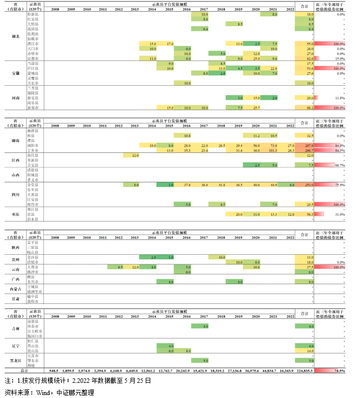 目前各地區承擔城鎮化建設的企業仍以城投平臺為主,因而本報告著眼于示范縣的城投平臺。第一部分梳理示范縣發債政策脈絡;第二、三部分重點梳理近三年(2020-2022年)的發債情況,用數據論證政策對示范縣發債的提振作用;第四部分,結合歷史和近三年兩個維度的發債數據,通過分析各省示范縣發債的差異,歸納出三類地區的風險特征。本報告選取自示范縣首次發債(2008年)以來,截至2022年5月25日全部示范縣城投平臺的發債數據。
