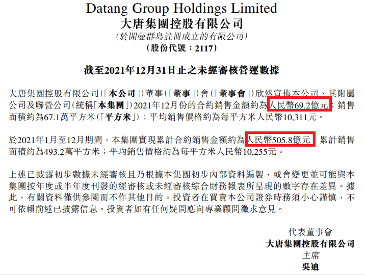 我們都說2021下半年房地產慘,但是對比起來,大唐集團控股的2021年12月似乎表現不錯。