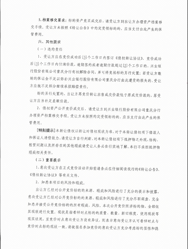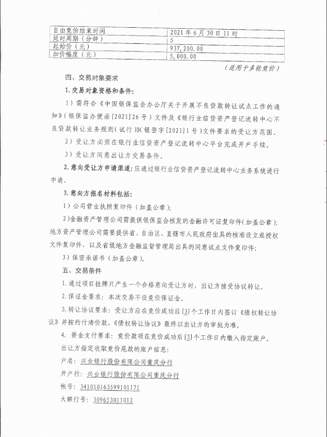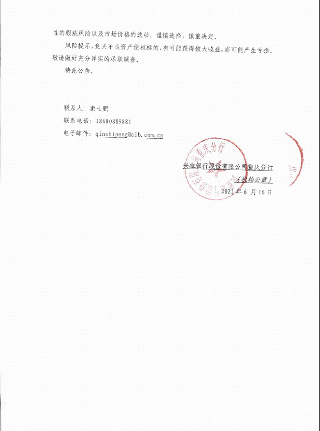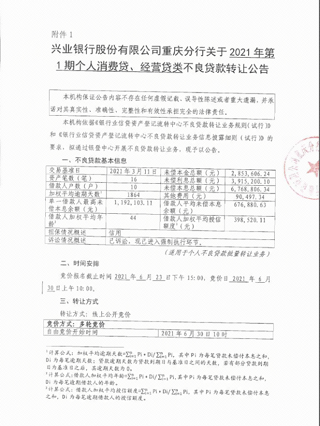 附:興業(yè)銀行股份有限公司重慶分行關(guān)于2021年第1期個人消費貸、經(jīng)營貸類不良貸款轉(zhuǎn)讓公告