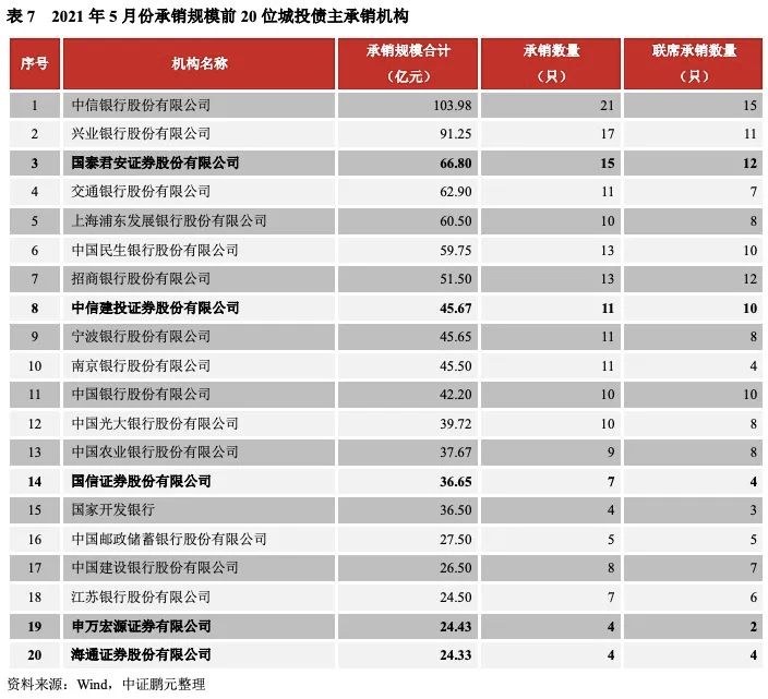 2021年5月,共有73家機構參與了城投債的承銷工作,發行下降致城投承銷商較上月減少28家??傮w來看,銀行類機構的總體排名較為領先。就承銷規模而言,中信銀行以103.98億元的承銷規模位居第一,連續5個月蟬聯榜首;興業銀行以91.25億元的承銷規模位居第二。承銷規模前二十位的機構中,券商類機構共有5家,較4月份減少1家。除國泰君安排名券商第一位,總排名第三位以外,中信建投、國信證券、申萬宏源和海通證券分別位列第8、14、19、20位。