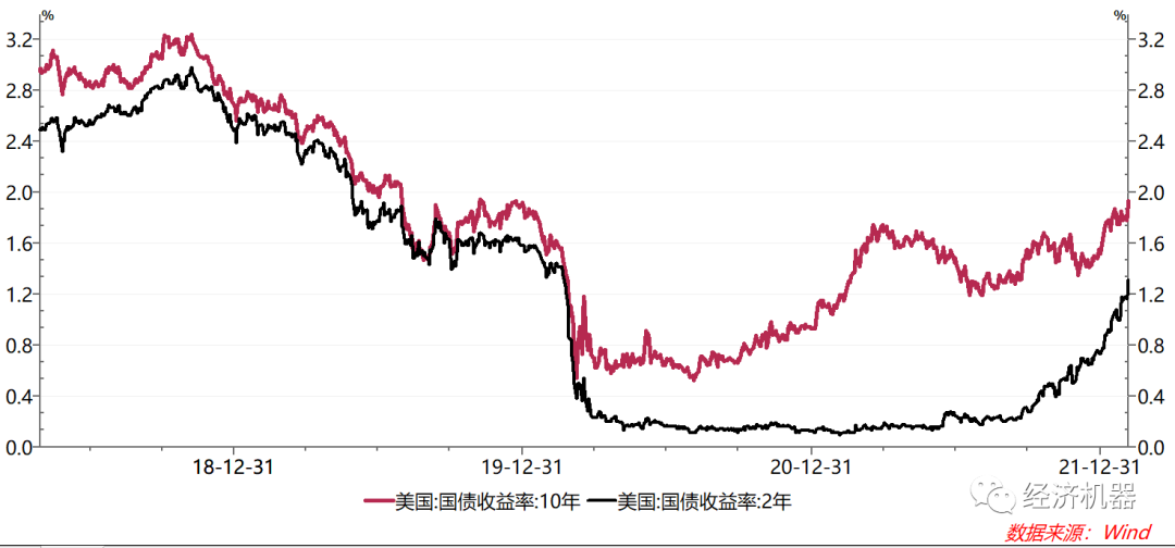 圖1、美國(guó)國(guó)債收益率:2年期 vs 10年期