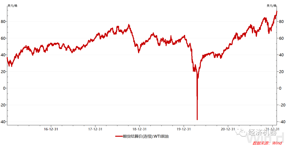 2月3日,以沙特和俄羅斯為首的OPEC+聯(lián)盟召開(kāi)月度產(chǎn)油政策會(huì)議,堅(jiān)持原定計(jì)劃在3月增產(chǎn)40萬(wàn)桶/日。而此前市場(chǎng)預(yù)期,OPEC+有可能加速增產(chǎn)。其后原油期貨也突破90元關(guān)口。春節(jié)期間(2022.1.31-2022.2.4)WTI原油期貨價(jià)格漲幅達(dá)4.72%,創(chuàng)2015年以來(lái)價(jià)格新高。