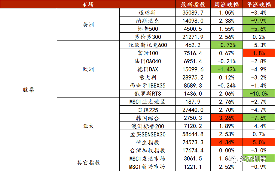 春節(jié)假期,外圍股市整體表現(xiàn)良好,漲多跌少。美股中,納斯達(dá)克指數(shù)周漲幅最大,為2.38%。亞太股市整體較為強(qiáng)勢(shì),其中恒生指數(shù)漲幅周漲幅最大,達(dá)4.34%。從年初累計(jì)收益看,大部分市場(chǎng)指數(shù)收益率仍是負(fù)值,但恒生指數(shù)達(dá)5%。恒生科技股、線下消費(fèi)股節(jié)日期間漲幅較大。