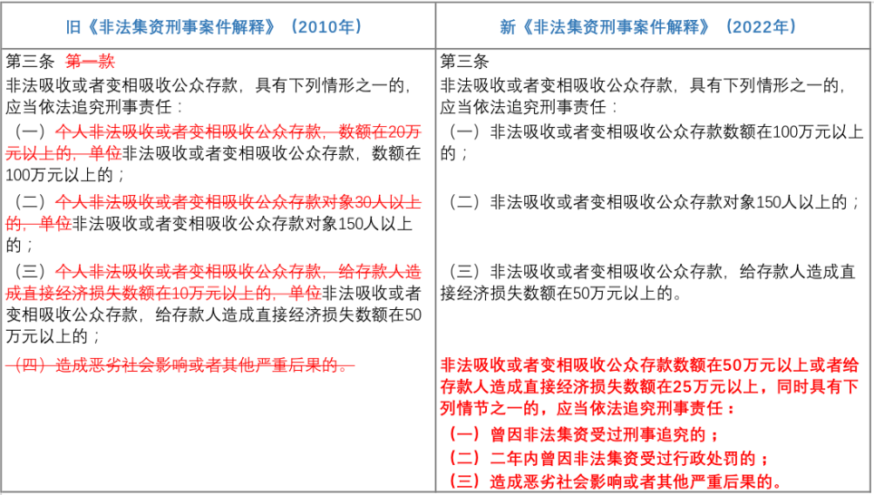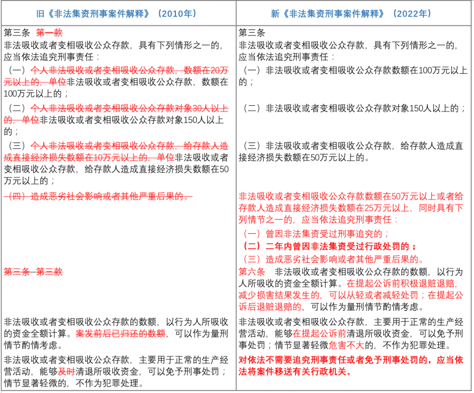 自2021年3月1日開始實施的《中華人民共和國刑法修正案(十一)》(以下簡稱“《刑修(十一)》),分別對非法吸收公眾存款罪與集資詐騙罪作出了重大修改,而為與《刑修(十一)》的修改相銜接,新《非法集資刑事案件解釋》亦作出了相對應的修訂。