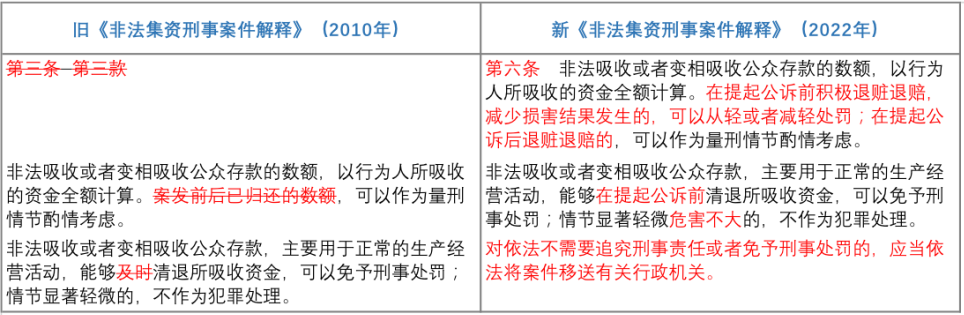 需要重點提示,《刑修(十一)》的上述規(guī)定,引起了新《非法集資刑事案件解釋》的相應變化。具體體現(xiàn)于“將吸收的公眾存款主要用于正常生產(chǎn)經(jīng)營活動”這一情形中,可以以退贓退賠免予刑事處罰的最終時間點被明確了,由之前的“及時”修改為如今的“提起公訴前”。這一修改在事實上限縮了在上述情形中法院對被告人退贓退賠后免予刑事處罰的適用范圍,變相倒逼行為人在更早的階段中將贓款退賠。