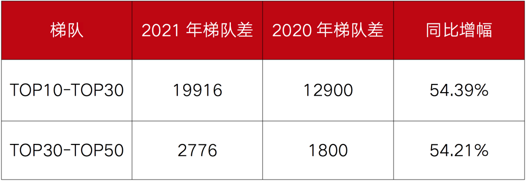 表:2021-2020年各梯隊企業(yè)在管門檻值梯隊差對比(萬平方米)