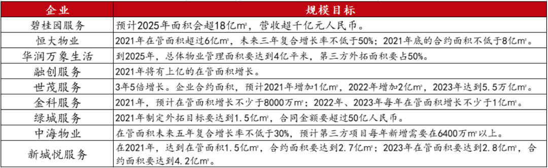 頭部企業(yè)更是定下高達數(shù)億的增長目標,恒大物業(yè)2021年在管面積將破6億㎡,合約面積不低于8億㎡;綠城服務(wù)合約面積將新增1.5億㎡,碧桂園服務(wù)則表示2025年規(guī)模超18億㎡,營收要超過千億元。世茂服務(wù)亦提出3年5倍計劃,2021年增加合約面積1億㎡,預(yù)計2023年合約面積達5.5億㎡。