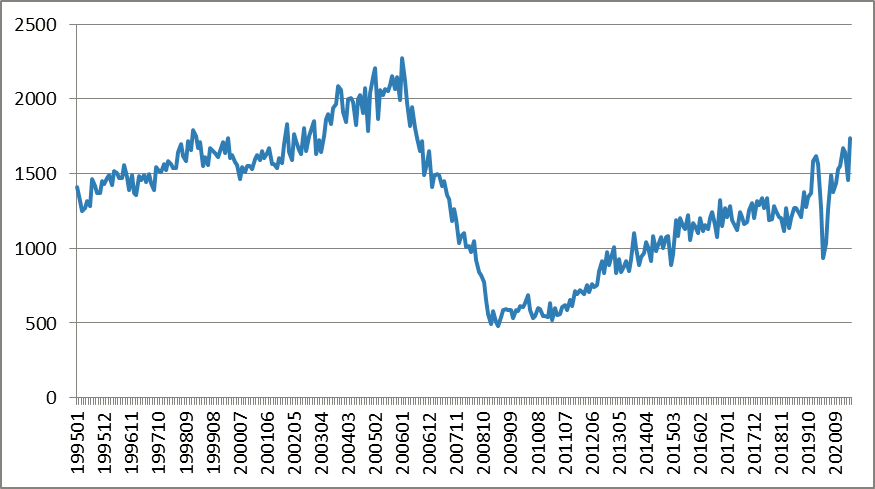 圖1:美國房屋新開工(千套)