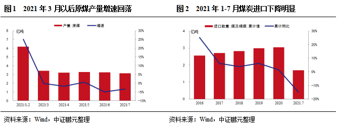 2021年1-7月原煤產量保持小幅增長,但產地供給持續受限。2021年1-7月,全國原煤產量22.6億噸,同比增長4.9%,比2019年同期增長4.8%。具體來看,2021年1-2月,全國原煤產量6.18億噸,同比增長25%,主要系受冷冬及下游需求旺盛影響,產地煤礦開工率高,同時2020年年初受疫情影響原煤產量偏低。3月份以后,晉陜蒙主產地安全環保檢查頻繁,包括山西省開展持續到年底的煤礦安全大排查,陜西榆林煤礦超產檢查,山西晉北地區中央環保組督查等,此外內蒙古反腐、煤管票持續。2021年3-7月,全國原煤產量同比增速分別為-0.2%、-1.8%、0.6%、-5%和-3.3%,煤炭實際供給持續受限。進口方面,2021年1-7月煤炭進口數量為1.7億噸,較去年同期下降15%,煤炭進口整體收緊。