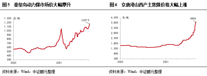 春節前供給偏緊張,同時寒冬采暖需求旺盛、焦鋼廠保持高開工率,動力煤價格快速上漲,秦皇島動力煤市場價(Q5500K,山西產)一度超過1,000元/噸;春節期間,產地大部分煤礦由于保供任務正常生產,同時下游工業企業放假,需求減弱,價格下降至2月末的567.5元/噸;3月份以后,下游企業復工復產,需求快速恢復,同時晉陜蒙主產地安全環保檢查頻繁,供給收緊,動力煤價格開啟上漲。二季度后,安全事故頻發導致主產區安檢力度加大,動力煤價格持續上漲,截至2021年9月初,秦皇島動力煤市場價(Q5500K,山西產)攀升至1,167.5元/噸,3月以來漲幅達到105.73%。煉焦煤方面,以京唐港山西產主焦煤為例,由于山西省全環保檢查頻繁,煉焦煤供給緊張,4月份以后下游鋼鐵需求走強,價格持續上漲至9月初的3,850元/噸,2021年以來漲幅超過130%。