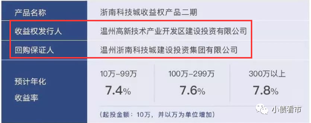 據悉,該收益權產品回購保證人為溫州浙南科技城建設投資集團有限公司(以下簡稱“浙南科技城建投集團”),產品期限為兩年,資金用途為浙南科技城八大重點項目建設,認購起點金額為10萬元。