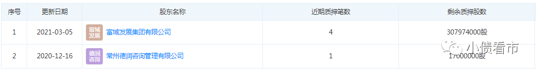 據(jù)最新數(shù)據(jù)顯示,富域發(fā)展和常州德潤(rùn)質(zhì)押新城控股股份分別3.08億和1700萬(wàn)股,股權(quán)質(zhì)押率分別為22.35%和12.34%,可以看出質(zhì)押率較高。