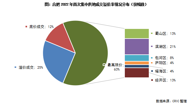 在土拍門(mén)檻降低、土地成本控制得當(dāng),以及部分政策利好消息的雙重影響下,合肥本次土拍平均溢價(jià)率達(dá)到11.2%,是2022年目前已經(jīng)進(jìn)行集中供地的城市中平均溢價(jià)率最高的一個(gè),15宗地塊觸及最高溢價(jià)率,占總成交地塊比例的63%。
