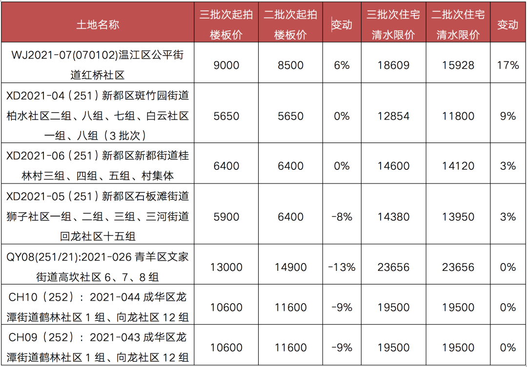 值得注意的是,成都第三輪集中供應(yīng)地塊的商品住宅清水限價(jià)多較此前明顯提升。如高新區(qū)大源板塊宅地的商品住宅清水限價(jià)提升至28500元/平方米,是成都開啟住宅限價(jià)以來出讓地塊中商品住宅限價(jià)最高的地塊,天府新區(qū)華陽鶴林村地塊的限價(jià)也由此前的17700元/平方米提升至2萬元/平方米以上。而在7宗回爐宅地中,多數(shù)地塊的商品住宅限價(jià)也給予了抬升,漲幅由3%~17%不等。