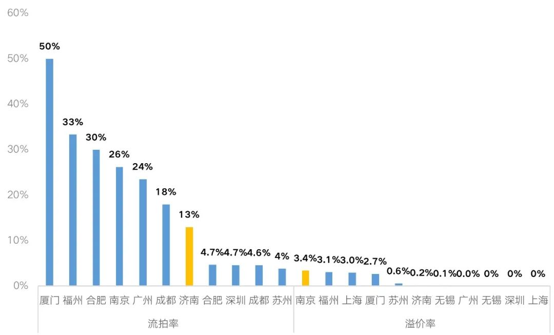 圖:已完成第三輪集中土拍城市的溢價(jià)率和流拍率對比