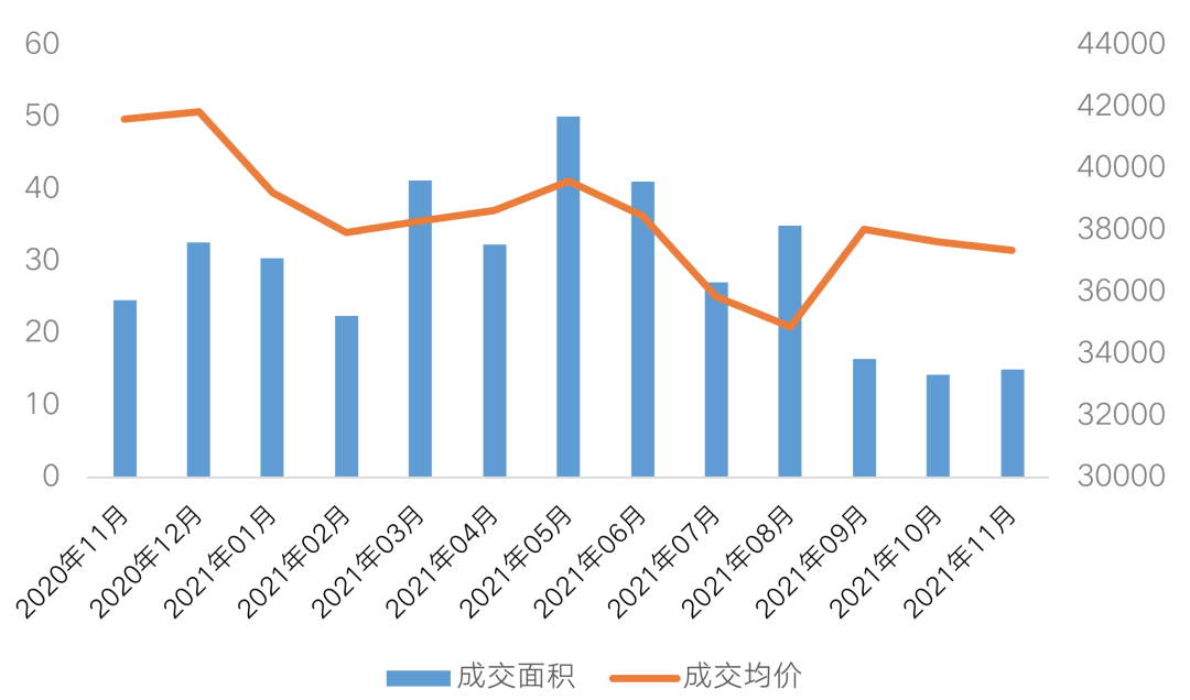 表:廈門近一年來商品成交成交量價(jià)走勢(萬平方米,元/平方米)
