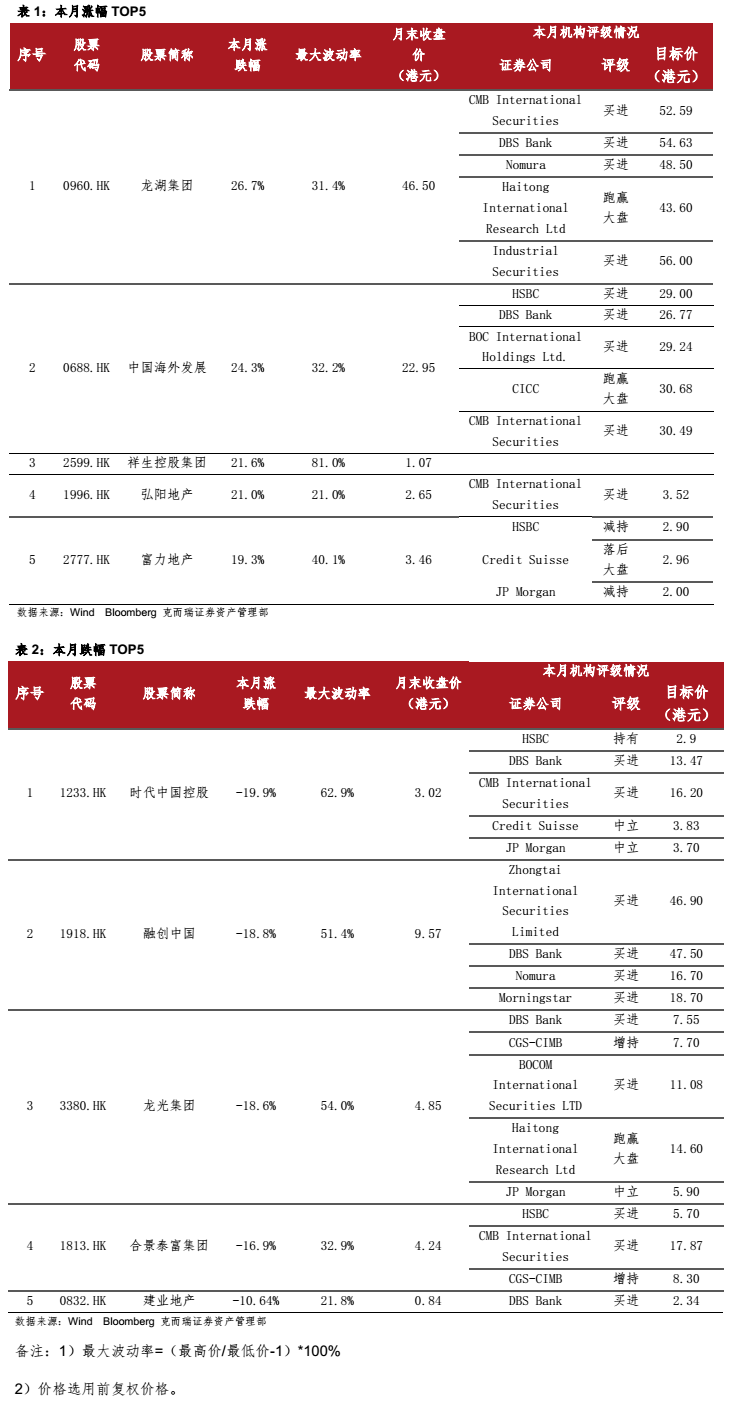 2020年1月1日至今,克而瑞內房股領先指數跌幅46.0%,同期恒生中國內地地產指數跌幅44.5%。恒生指數跌幅17.2%,房地產(申萬)板塊跌幅22.7%。
