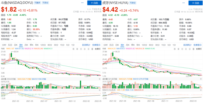 目前,虎牙距50.82美元每股的最高點已跌至4.42美元每股,跌幅高達91.3%;斗魚距最高點20.54美元每股已跌至1.82美元每股,跌幅高達91%。