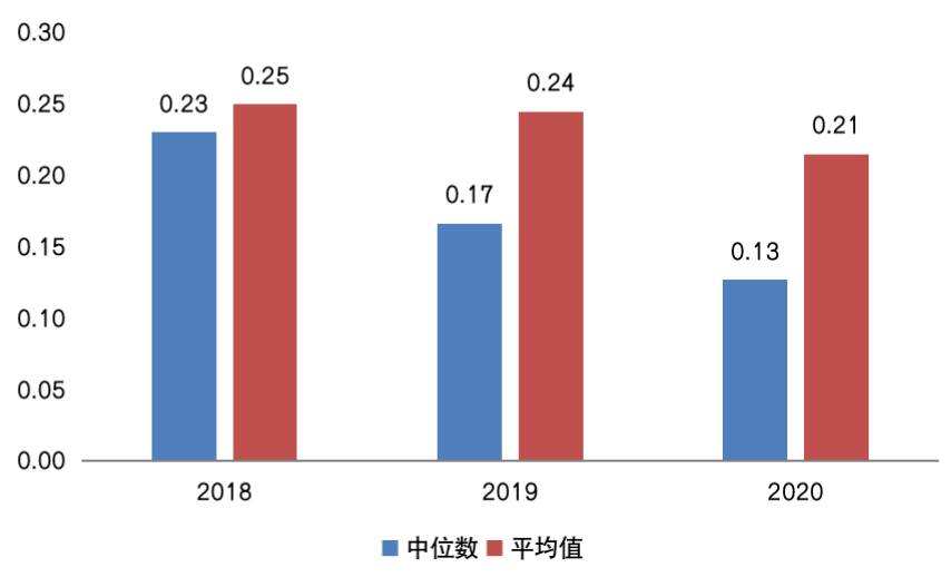 整體來看,2018-2020年間27家房企的整體凈現(xiàn)比呈逐年小幅下降趨勢,凈現(xiàn)比平均值由0.25下降至0.21,中位數(shù)由0.23下降至0.13。主要由于行業(yè)調(diào)整期下整體增速的放緩,以及貸款監(jiān)管趨嚴(yán)、放貸節(jié)奏放緩下房企回款壓力的增大。