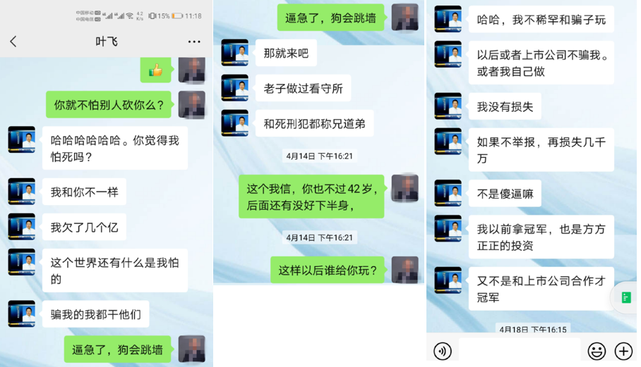 “看我最近跟葉飛的聊天就知道葉飛的性格了,只要有人得罪他就天不怕、地不怕的那種,包括光頭我跟他也沒有實質(zhì)的業(yè)務(wù)往來。我怕有一天我得罪他了,他也會這樣對我的。”該好友說道。