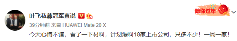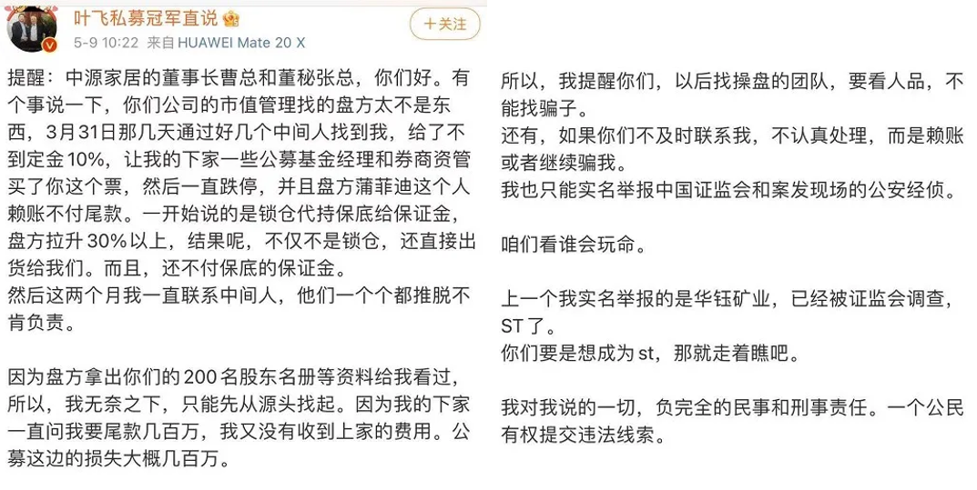 其實早在一個月前,葉飛在微博中就曾表示:“下一個我要實名舉報中源家居,提前給大家預(yù)告一下。” 這是葉飛首次公開提到中源家居(603709.SH),并稱會舉報更多欺騙他、讓他損失過的上市公司。