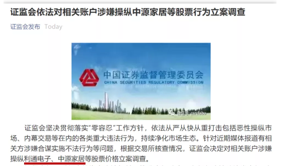 此外,還有3家券商也被卷入其中,分別是民生證券、恒泰證券、天風(fēng)證券。周五(5月14日)證監(jiān)會表示已啟動核查程序,周日(5月16日)證監(jiān)會進一步發(fā)聲,依法對相關(guān)賬戶涉嫌操縱中源家居等股票行為立案調(diào)查。