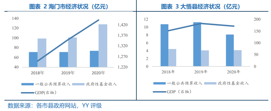東部更多縣城入選,可能因為東部經濟更為發達,更大體量的經濟可撐起更多的融資空間,加碼基建,以進行逆周期調節。例如江蘇省隸屬于南通市的海門市,與上海直線距離為60公里,區位條件優越,支柱產業包括先進裝備制造等。2020年實現GDP1442.6億元,一般公共預算收入73.5億元,政府性基金收入128億元,經濟實力較強;海門市尚未有城投發行債券,不考慮城投有息負債,地方政府債務余額/一般公共預算收入為2.04,地方政府債務余額/(一般公共預算收入+政府性基金收入)為0.74,海門市債務負擔較輕,有較大的融資空間。而西部一些經濟薄弱縣城入選主要因為政策傾斜,例如湖北省孝感市下的大悟縣,地處大別山西端南麓,整體經濟發展水平偏弱,2020年4月才脫貧摘帽,2019年GDP為182.8億元(考慮到2020年疫情影響,選用2019年數據),一般預算收入為11.23億元,政府性基金收入為4.15億元,考慮到大悟縣為著名革命老區,發改委給予一定的政策支持,希望該縣能借助資本市場進行融資以發展當地經濟。