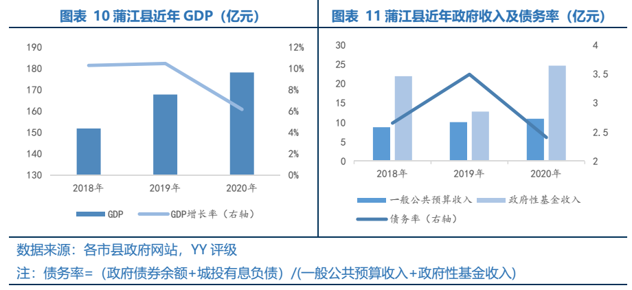 蒲江縣經濟規模相對較小,但是屬于成都“半小時經濟圈”,具有一定的發展潛力,政府性基金收入規模相對較高,債務率相對較低。蒲江縣為成都市遠郊縣之一,支柱產業為小機械制造和生態食品。蒲江縣區位較好,屬于成都“半小時經濟圈”,毗鄰天府新區,待天蒲快速路新建工程(18km)完工后將進一步拉近蒲江縣和天府新區距離。蒲江縣是“進藏入滇”的咽喉要道,投資百億元的川藏鐵路蒲江鐵路物流港已在建設,中德國別合作區已招商,蒲江縣具有一定的發展潛力。2020年實現GDP178.18億元,2018、2019年GDP增速為10%左右,一般公共預算收入為10.94億元,經濟規模偏小但增速較高。近年蒲江縣房價為上升趨勢,根據房天下,2020年住宅成交均價在7600元左右,2020年政府性基金收入24.66億元,政府性基金收入相較于經濟規模偏高。地方債務率在250%左右,債務率相對偏低。