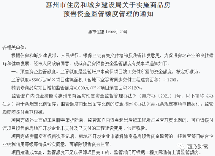 6月1日,惠州市住房和城鄉建設局發布《關于實施商品房預售資金監管額度管理的通知》,我們認為,這是一份非常具有借鑒意義的政策性文件,具體附圖如下: