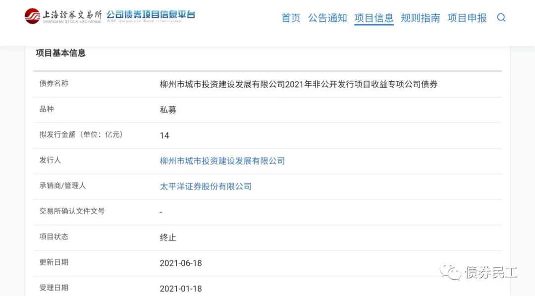 5、項目收益專項公司債券。柳州市城市投資建設發展有限公司2021年非公開發行項目收益專項公司債券,擬發行金額14億元,申報時間為2021年1月18日,終止時間為2021年6月18日。