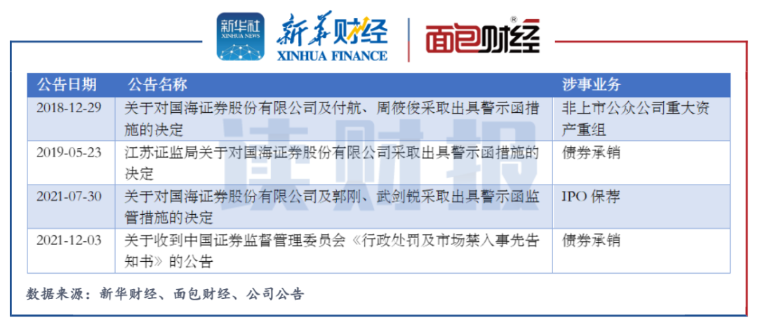 比如,2021年12月份,因擔任勝通集團公司債券“16勝通01”“16勝通03”“17勝通01”的主承銷商而涉事虛假記載、未盡職調查等,公司被沒收違法所得1798萬元,并處以60萬元罰款。