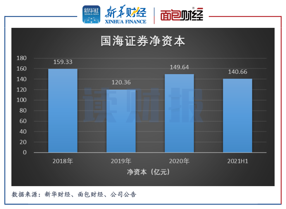 但是,國海證券仍然“缺錢”。2021年6月末,公司凈資本140.66億元這一券商關鍵監管指標,較上年末下降約8.98億元。
