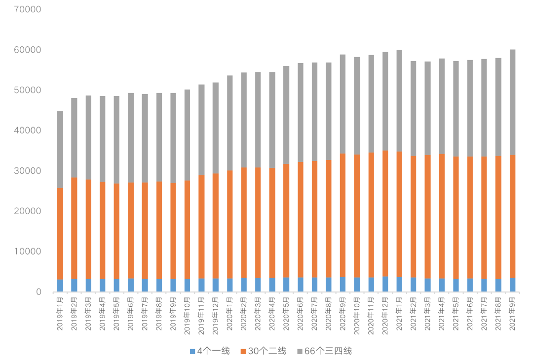從二手住宅存量市場(chǎng)來看,2021年三季度60城二手住宅庫(kù)存迅速積壓。