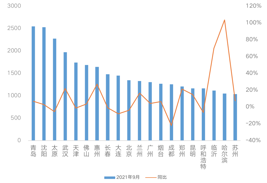 二線城市中,北部?jī)?nèi)陸城市諸如沈陽、青島、太原9月末狹義庫(kù)存量均超2000萬平方米,位列本月末狹義庫(kù)存總量TOP3。同比來看,漲跌參半,漲幅超20%的主要是北部和中部等弱二線城市,鄭州、武漢、銀川、哈爾濱、南昌等,庫(kù)存積壓情況顯著。