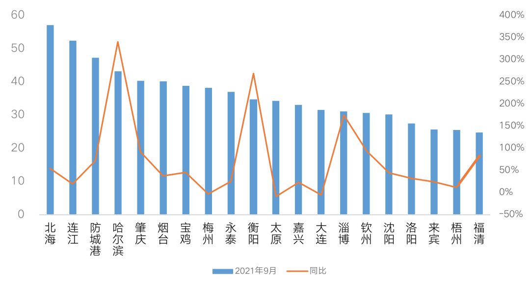 三四線城市由于供過于求加劇,成交下行致去化周期激增至17.53個(gè)月,高于百城平均。反觀下跌城市以東南沿海三四線為主,比如德清、鹽城等城市9月末消化周期維持在一年以下。而北海、連江、防城港、肇慶、煙臺(tái)、寶雞、永泰、衡陽、淄博等基本面缺乏支撐的三四線城市消化周期高達(dá)30個(gè)月以上,且同環(huán)比齊增,庫(kù)存風(fēng)險(xiǎn)依舊較大。