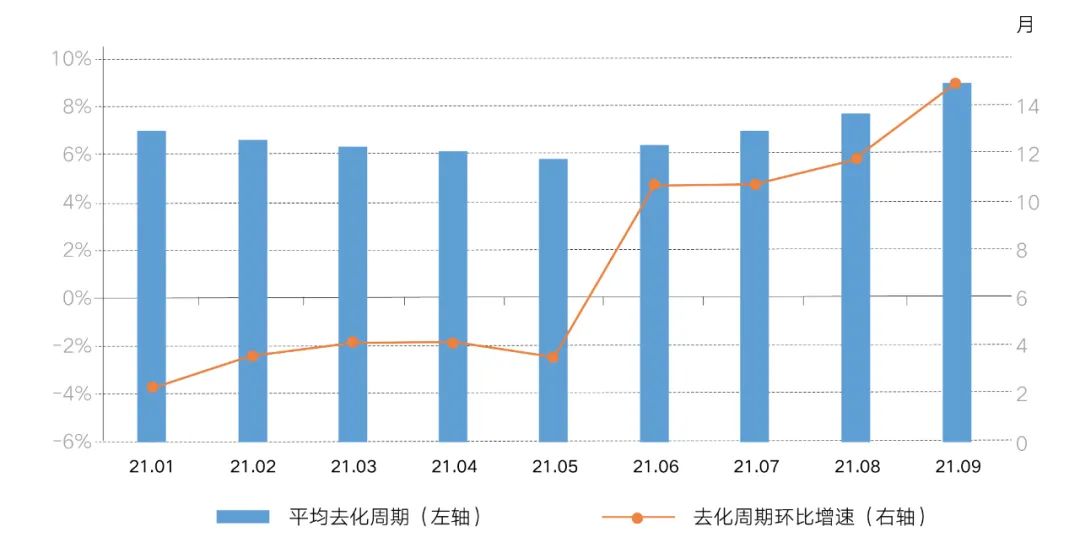 市場(chǎng)下行壓力加劇,成交持續(xù)遇冷,加之9月末狹義庫(kù)存穩(wěn)步上揚(yáng),導(dǎo)致去化周期加速上行,較8月末的13.04個(gè)月上漲至14.92個(gè)月。