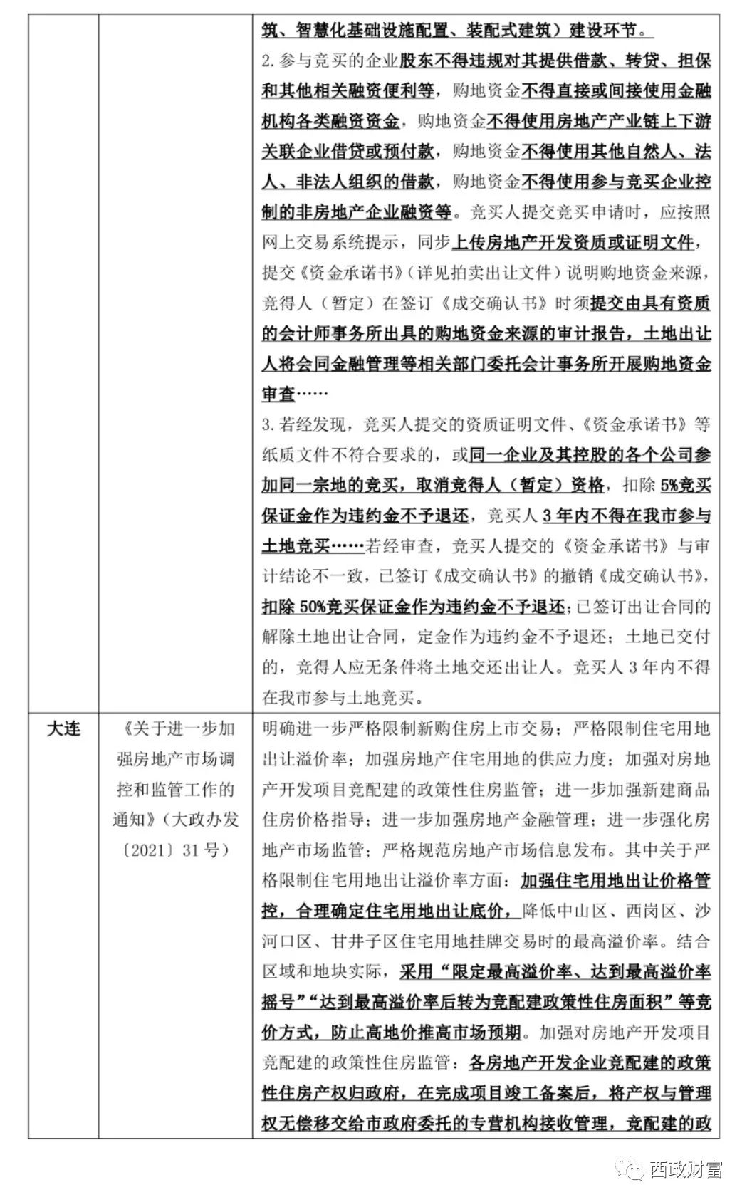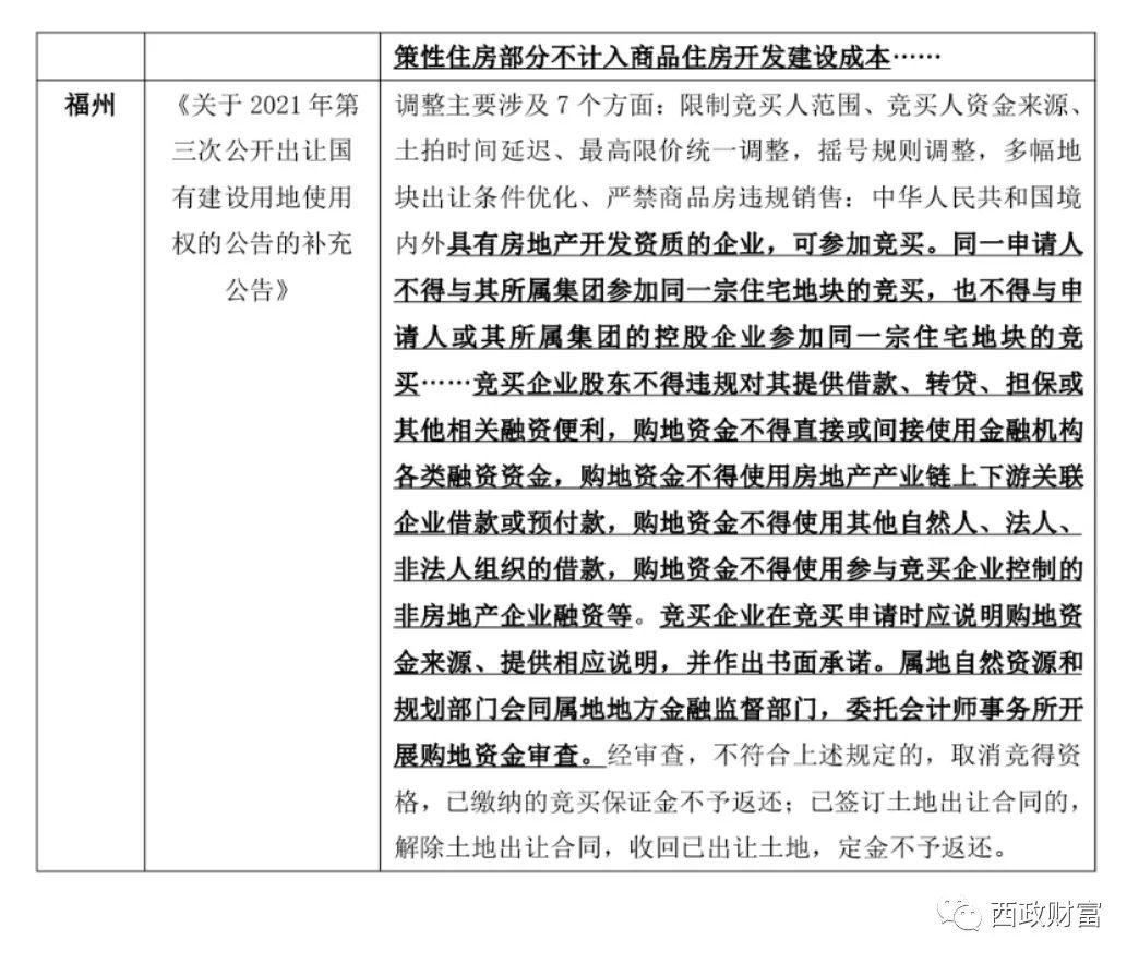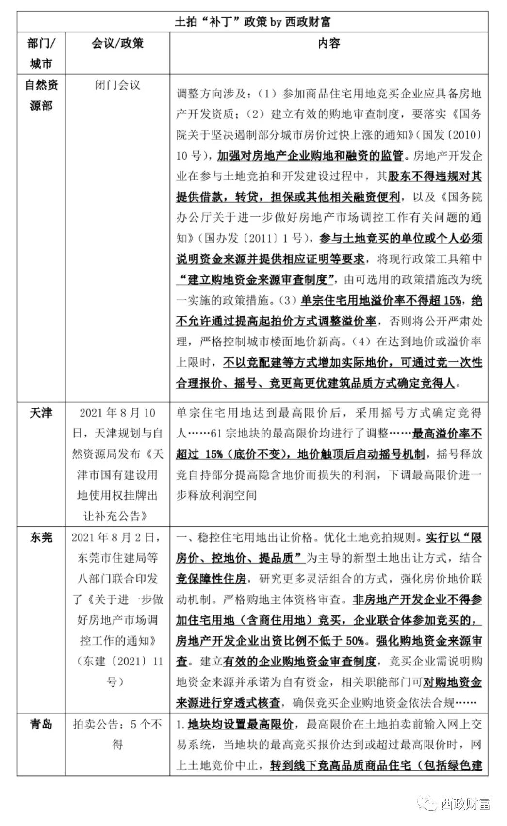 在第一次集中供地落下帷幕后,2021年7月22日,中共中央政治局常委、國務院副總理韓正再出席加快發展保障性租賃住房和進一步做好房地產市場調控工作電視電話會議并講話中提到,要加快完善“穩地價”工作機制,優化土地競拍規則,建立有效的企業購地資金審查制度。然后,電視電話會上,廣州、福州、北京、長沙等四個城市人民政府作了發言。住建部房地產市場監管司司長張其光表示“還要著力建立房地聯動機制,推廣北京市的做法,限房價、控地價、提品質,建立購地企業資格審查制度,建立購地資金審查和清退機制。隨后自然資源部閉門會議以及近期幾個城市紛紛對土拍規則進行了補充規定。以下做簡要整理: