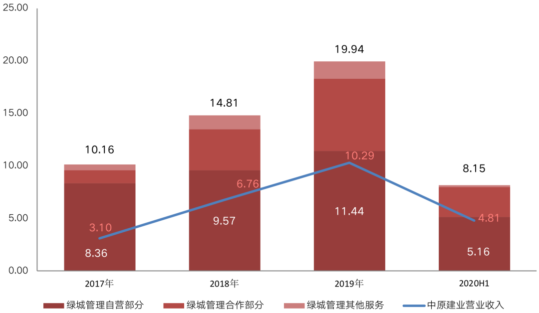 業務模式的不同是導致綠城管理與中原建業存在較大的規模差距的主要原因。綠城管理的代建業務既有自行運營,也與其他業務伙伴合作,意味著綠城管理的代建項目中有很大一部分是合作項目;而中原建業則選擇直接管理所有項目。若剔除合作項目規模,2019年綠城管理自營的在管建面仍然比中原建業仍高出了82%。