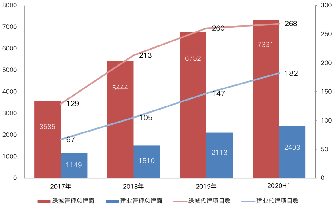 從規模來看,綠城管理的管理總建筑面積相對較大。2020年上半年,綠城管理的在管建面達到了7331萬平米,代建項目個數達到了268個,分別比中原建業高出了205%及47%。