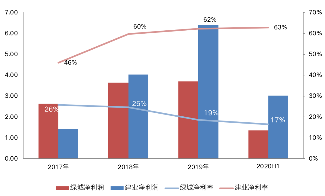 從凈利潤的規模來看,中原建業自2018年起實現了反超,2020上半年中原建業的凈利潤為3.02億元,相比綠城管理高出了125%。從凈利率來看,2018年起中原建業的凈利率均維持在60%以上,2020年上半年中原建業的凈利率為63%,相比綠城管理高出了約47個百分點。