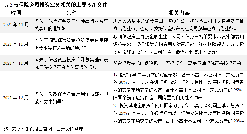 投資業務方面,2021年以來保險資金運用范圍得到進一步拓展,監管機構引導保險資金加大標準化產品投資力度。監管機構允許符合要求的保險資金參與證券出借業務,投資公開募集基礎設施證券投資基金;取消保險資金可投金融企業(公司)債券白名單要求以及外部信用評級要求,有利于拓寬保險資金運用范圍,優化保險資產配置;按照保險公司信用風險管理能力和償付能力充足率,分類設置可投資的非金融企業(公司)債券的最低外部信用評級要求;增設投資于非標準化金融產品和不動產資產的比例限制,防范非標準化資產領域投資風險,引導保險公司平穩運營資金的同時,也可能導致收益率有所下降。