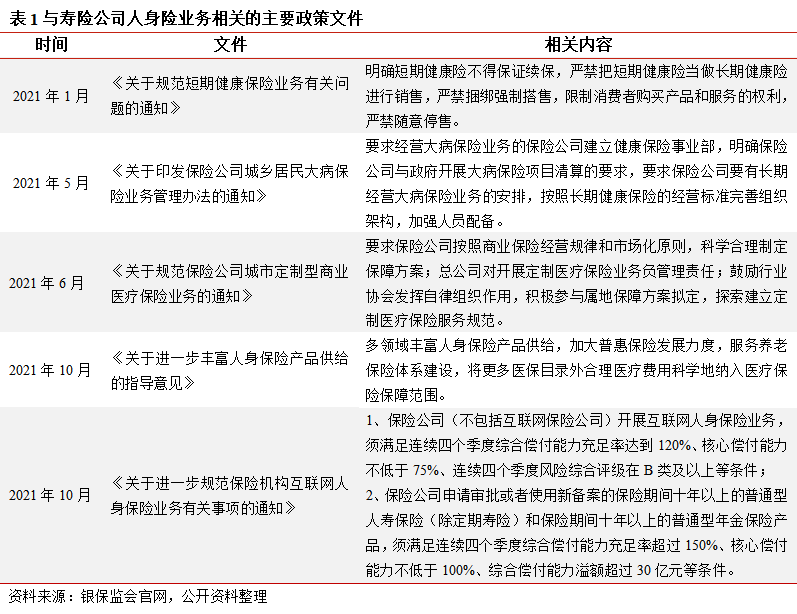 2021年以來監管制度體系進一步完善,引導行業持續回歸保障本源。人身險業務方面,監管機構明確短期健康險不得保證續保,嚴禁把短期健康險當做長期健康險進行銷售;提出進一步豐富人身險產品供給,加大普惠保險發展力度;規范互聯網人身保險業務市場秩序,基于保險產品類別對網銷人身險產品的公司設定了分檔的償付能力要求。此外,銀保監會人身保險監管部建立了人身保險產品“負面清單”機制,2022版負面清單在2021版負面清單的基礎上進一步擴容,新增了增額終身壽險的保額遞增比例超過定價利率、醫療保險條款混淆“惡性腫瘤”和“惡性腫瘤-重度”概念、短期健康保險產品條款中關于不保證續保的表述不符合監管規定等問題,保險產品監管的透明度和有效性提升。