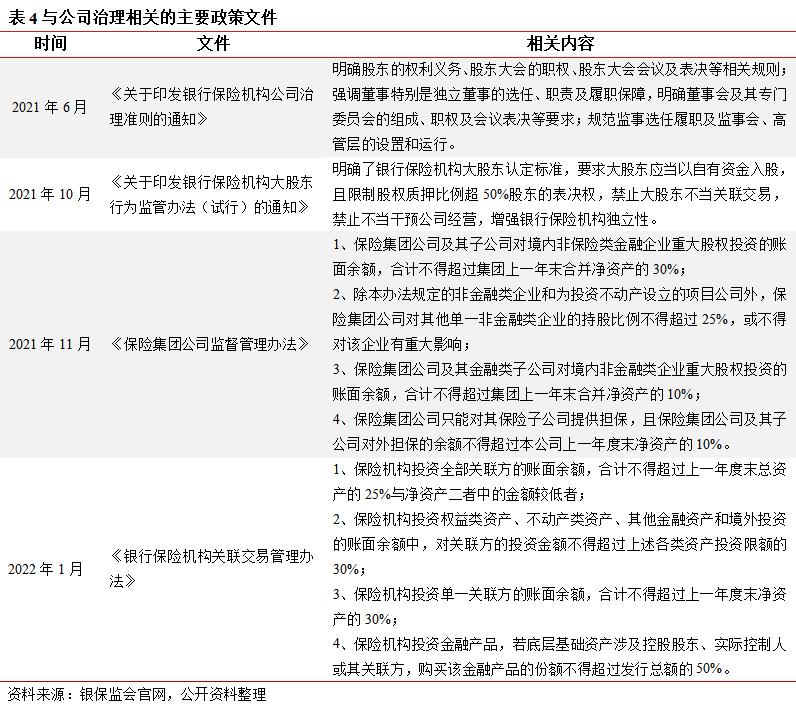 公司治理方面,2021年監管機構發布公司治理準則,明確各治理主體的職責邊界、履職要求;出臺銀保機構大股東新規,明確了銀行保險機構大股東認定標準,規范大股東行為;加強保險集團公司治理監管,新增完善了集中度風險管理、對外擔保管理等具體監管要求;明確銀保機構關聯方及關聯交易認定標準,對與資金相關的高風險關聯交易設定比例限額,防范向大股東提供融資的亂象問題,有助于行業規范發展。