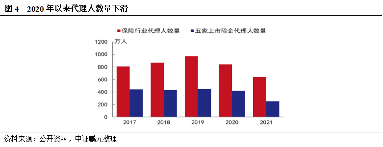 中證鵬元預計代理人規模仍有進一步下降可能性,對2022年新單保費增長帶來一定壓力。受人口紅利的逐漸消退、壽險行業轉型倒逼壽險公司重視代理人隊伍質量建設等因素影響,代理人規模自2019年達到頂峰后,開始出現持續下滑,2021年末代理人合計641.9萬人,較2020年末下降23.86%。近期監管機構對銷售環節的檢查力度進一步加強,2021年11月《人身保險銷售管理辦法(征求意見稿)》征求意見,擬實施保險銷售人員分級管理、不允許自保件和互保件參與考核、限制傭金比例等,預計代理人規模仍有進一步下降可能性,對2022年新單保費增長帶來一定壓力。