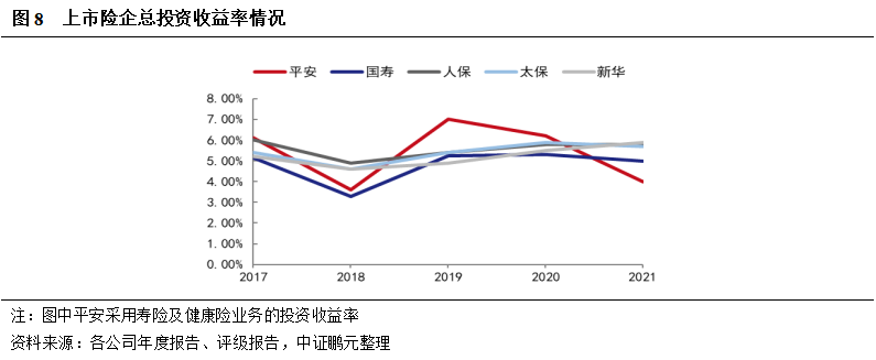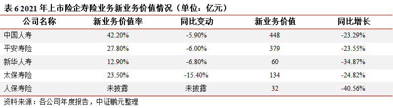 在新單保費增長乏力的背景下,新業務價值率下滑,新業務價值承壓。從新業務價值率來看,已披露2021年新業務價值率的4家上市險企新業務價值率均同比下滑,主要有產品價格和產品結構兩方面原因:產品價格方面,在行業下行的背景下,壽險公司競爭加劇,產品價格下調;產品結構方面,客戶購買力下降,對保障型產品需求降低,重疾銷售難度大幅提升,在行業整體轉型困難的背景下,為維持保費規模的穩定,部分壽險公司不得不擴大低價值率的儲蓄型產品銷售比例,使得新業務價值率明顯下滑。此外,新舊重疾定義切換后,新業務價值率較高的重疾險業務整體價值率有所下降,給新業務價值的增長帶來壓力。從新業務價值來看,2021年5家上市險企新業務價值均同比下滑,在新單保費增長乏力、新業務價值率下滑的環境下,未來新業務價值承壓。