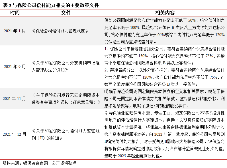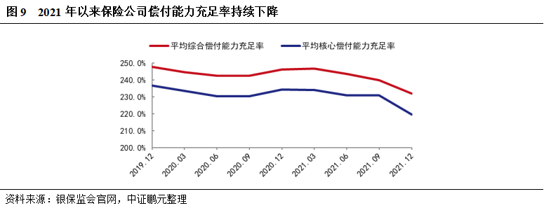 (4) 2022年起償二代二期工程正式實施,對險企資本認定趨嚴,行業整體償付能力充足性水平或將繼續下滑,部分險企面臨資本補充壓力。