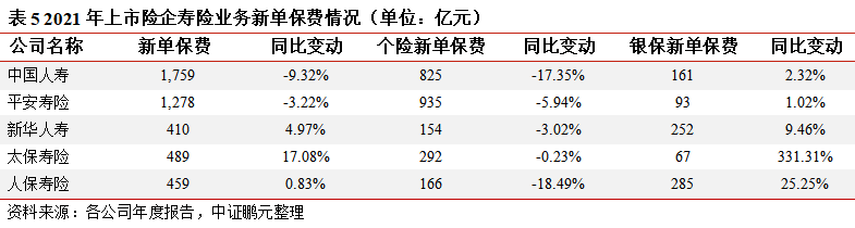 受疫情、代理人規模下降、普惠型產品沖擊以及保險購買力下降影響,新單保費增長乏力。從5家上市險企來看,2021年中國人壽、平安壽險新單保費分別同比下降9.32%、3.22%,主要系個險新單保費明顯下降;新華人壽、太保壽險和人保壽險新單保費實現正增長,主要系其加大了銀保渠道業務拓展力度、銀保新單保費明顯增長。值得注意的是,2021年5家上市險企個險新單保費均較2020年有所下降,拖累整體新單保費增長。考慮到疫情帶來的收入不確定性使得居民的保險購買力下降,“惠民保”等價格較低的城市定制型醫療報銷型產品對商業重疾險需求有一定的擠出效應,且短期內代理人效能提升帶來的正面影響不抵代理人規模下滑帶來的負面影響,新單保費規模增長乏力。